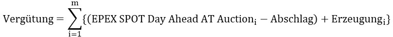 Die gesamte monatliche Vergütung ergibt sich dann aus dem Summenprodukt der übernommenen Energie je Viertelstunde mit dem Viertelstundenpreis abzüglich eines Abschlags je übernommenen kWh.