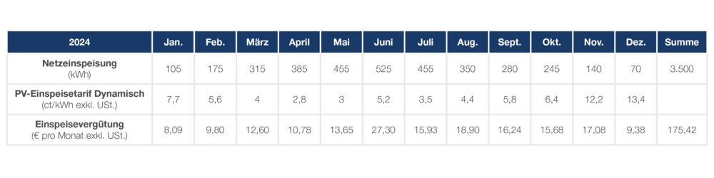 Grundlage dieser Beispielrechnung ist ein typischer Haushalt mit einer PV-Anlage von 5 kWp mit einer Jahreseinspeisung von 3.500 kWh auf Basis des Standardeinspeiseprofils E1.